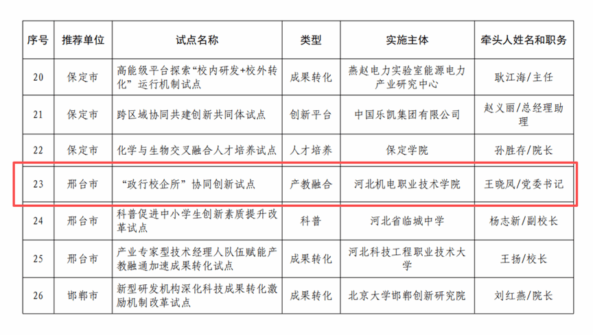 近日,河北省科学技术厅、河北省教育厅和河北省人力资源和社会保障厅联合发布了《关于开展河北省教育科技人才一体化发展试点的通知》(冀科政〔2026〕1号),经过严格评审、综合研判等程序,遴选了47家试点单位,我校申报的“政行校企所”协同创新试点成功获批。