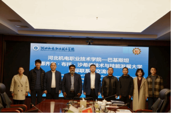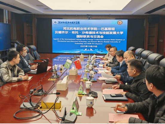 2025年10月25日,巴基斯坦贝娜齐尔·布托·沙希德技术与技能发展大学(BBSUTSD)副校长拉苏尔·布克斯·马哈尔(Rasool Bux Mahar)一行到访河北机电职业技术学院,与河北省机电装备智能感知与先进控制技术创新中心(以下简称“创新中心”)开展国际技术合作与交流洽谈会。学校副校长张能云热情接待来宾,学校办公室、继续教育培训部、创新中心核心团队、电气工程系相关负责人共同参会。